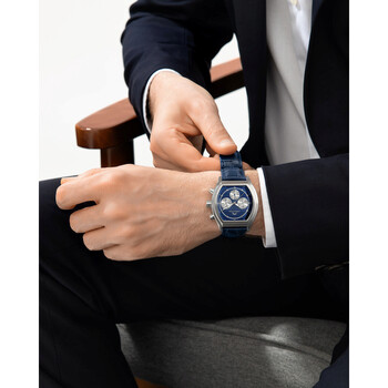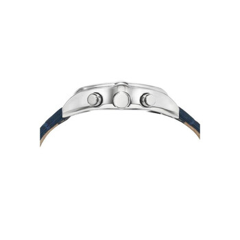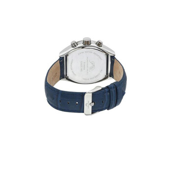 Porsamo Bleu Roman Chronograph Men's Watch; Genuine Leather Strap; Silver and Blue Silver-tone stainless steel case with a blue leather strap. Fixed silver-tone stainless steel bezel. Blue dial with silver-tone hands and index hour markers. Minute markers around the outer rim. Dial Type: Analog. Luminescent hands and markers. Chronograph - three sub-dials displaying: 60 second, 30 minute and 24 hour. Miyota JS 20 Quartz quartz movement. Scratch resistant mineral crystal. Pull / push crown. Solid case back. Round case shape, case size: 42 mm, case thickness: 12 mm. Band width: 22 mm. Buckle clasp. Water resistant at 50 meters / 165 feet. Functions: hour, minute, second. Roman Series. Luxury watch style. Watch label: Japan Movt. Porsamo Bleu Roman Quartz Blue Dial Men's Watch 1292EROL.