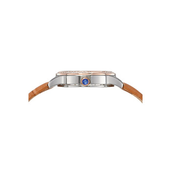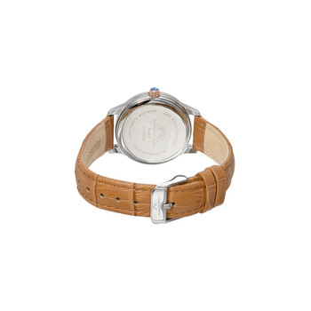 Silver-tone stainless steel case with a brown genuine leather strap. Fixed rose gold-tone stainless steel bezel. Silver-tone dial with rose gold-tone hands and Arabic numeral hour markers. Dial Type: Analog. Date display at the 3 o'clock position. Miyota Caliber 2115 quartz movement. Scratch resistant mineral crystal. Solid case back. Round case shape, case size: 34 mm. Buckle clasp. Water resistant at 50 meters / 165 feet. Functions: date, hour, minute, second. Ruby Series. Dress watch style. Watch label: Japan Movt. Porsamo Bleu Ruby Quartz Silver Dial Ladies Watch 1141DRUL.