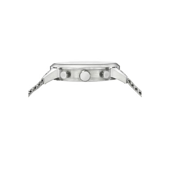 Porsamo Bleu Simon Chronograph Men's Watch; Stainless Steel Mesh Band; Silver and White Silver-tone stainless steel case and bracelet. Fixed silver-tone stainless steel bezel. Silver-tone dial with silver-tone hands and index hour markers. Minute markers around the outer rim. Dial Type: Analog. Luminescent hands and markers. Quartz movement. Scratch resistant mineral crystal. Pull / push crown. Solid case back. Round case shape, case size: 44 mm. Band width: 22 mm. Fold over with double push button release clasp. Water resistant at 100 meters / 330 feet. Functions: chronograph, hour, minute, second. Simon Series. Luxury watch style. Watch label: Japan Movt. Porsamo Bleu Simon Chronograph Quartz Silver Dial Men's Watch 1321ASIS.