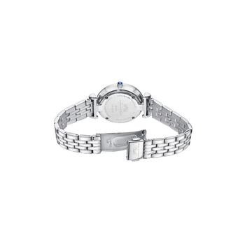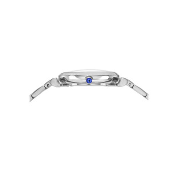 Silver-tone stainless steel case and bracelet. Fixed silver-tone stainless steel bezel. Silver-tone dial with silver-tone hands and index hour markers. Dial Type: Analog. Luminescent hands and markers. Miyota Caliber 2035 quartz movement. Scratch resistant mineral crystal. Solid case back. Round case shape, case size: 32 mm. Deployment with push button release clasp. Water resistant at 30 meters / 100 feet. Functions: hour, minute, second. Additional Info: genuine, natural abalone dial. Sylvie Series. Dress watch style. Watch label: Japan Movt. Porsamo Bleu Sylvie Quartz Silver Dial Ladies Watch 1131ASYS.