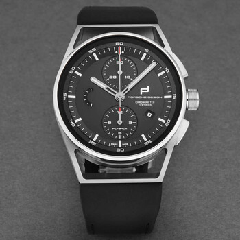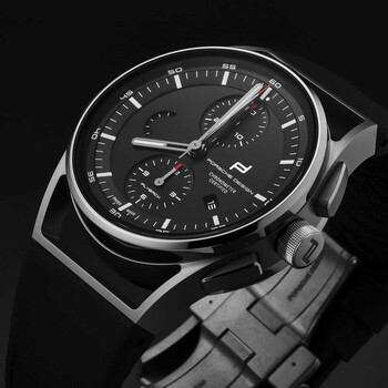Silver-tone titanium case with a black rubber strap. Fixed silver-tone stainless steel bezel. Black dial with silver-tone hands and index hour markers. Minute markers around the outer rim. Dial Type: Analog. Luminescent hands and markers. Date display at the 4 o'clock position. Automatic movement. Scratch resistant sapphire crystal. Transparent case back. Round case shape, case size: 42 mm. Fold over clasp with a safety release. Water resistant at 100 meters / 330 feet. Functions: chronograph, date, hour, minute, second. Globetimer Series. Luxury watch style. Watch label: Swiss Made. Porsche Design Globetimer Chronograph Automatic Black Dial Men's Watch 6023.6.04.005.07.2.