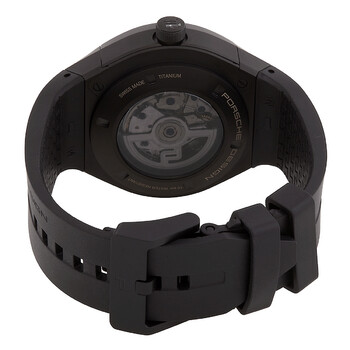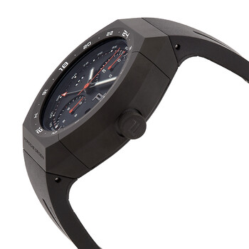 Black titanium case with a black rubber strap. Fixed black titanium bezel. Black dial with luminous black hands and index-Arabic numeral hour markers. Minute markers around the outer rim. Dial Type: Analog. Luminescent hands. Date display at the 4 o'clock position. Chronograph - three sub-dials displaying: 60 second, 30 minute and 12 hour. Automatic movement. Scratch resistant sapphire crystal. Screw down crown. Transparent see through case back. Round case shape, case size: 45.50 mm. Folding clasp. Water resistant at 100 meters / 330 feet. Functions: date, hour, minute, second. Monobloc Actuator Series. Sport watch style. Watch label: Swiss Made. Porsche Design Monobloc Actuator Automatic Black Dial Men's Watch 6030.6.01.007.05.2.