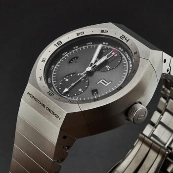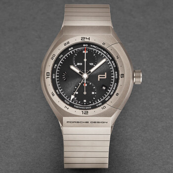 Grey titanium case and bracelet. Fixed black titanium bezel. Black dial with luminous black hands and index hour markers. Minute markers around the outer rim. Dial Type: Analog. Luminescent hands. Date display at the 4 o'clock position. Chronograph - three sub-dials displaying: 60 second, 30 minute and 12 hour. ETA Caliber Valjoux 7754 automatic movement with a 48-hour power reserve. Scratch resistant sapphire crystal. Screw down crown. Transparent see through case back. Round case shape, case size: 45.5 mm, case thickness: 15.60 mm. Foldover clasp. Water resistant at 100 meters / 330 feet. Functions: chronograph,date, hour, minute, second,GMT,tachymeter. Monobloc Actuator Series. Sport watch style. Watch label: Swiss Made. Porsche Design Monobloc Actuator Chronograph Automatic Black Dial Men's Watch 6030.6.02.001.02.5.