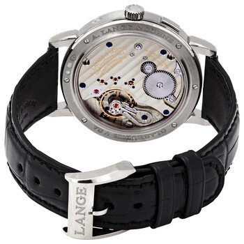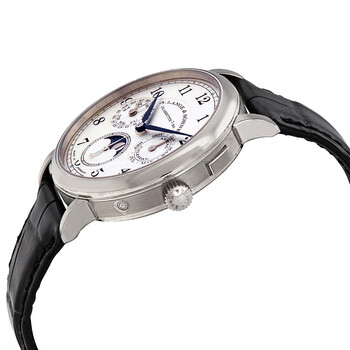 Pre-owned 18kt white gold case with a black leather strap. Fixed 18kt white gold bezel. Silver dial with blue alpha-style hands and Arabic numeral hour markers. Minute markers around the outer rim. Dial Type: Analog. Annual calendar. Three sub-dials displaying: dual date / day of the week, month, dual moonphase/ small seconds. A. Lange & Sohne calibre L051.3 hand wind movement, containing 26 Jewels, bitting at 21600 vph, and has a power reserve of approximately 72 hours. Scratch resistant sapphire crystal. Pull / push crown. Transparent case back. Round case shape. Case size: 40 mm. Case thickness: 10.1 mm. Band width: 20 mm. Tang clasp. Water resistant at 30 meters / 100 feet. Functions: annual calendar, moon phase, month, date, day, hour, minute, second, power reserve indicator. 1815 Annual Calendar Series. Luxury watch style. Watch label: Made in Germany. A. Lange Sohne 1815 Annual Calendar Moonphase Men's 18kt White Gold Watch 238.026.