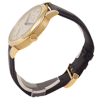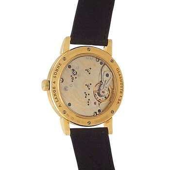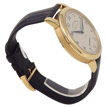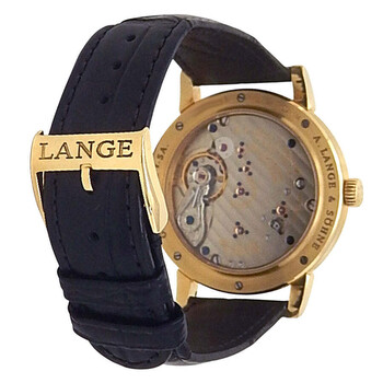 Yellow gold-tone 18kt yellow gold case with a black leather strap. Fixed yellow gold-tone 18kt yellow gold bezel. Silver-tone dial with blue hands and Arabic numeral hour markers. Minute markers around the outer rim. Dial Type: Analog. Hand wind movement. Scratch resistant sapphire crystal. Transparent see through case back. Round case shape, case size: 40 mm. Buckle clasp. Functions: hour, minute, second. 1815 Series. Dress watch style. Pre-owned A. Lange Sohne 1815 Hand Wind Silver Dial Men's Watch 233.021.