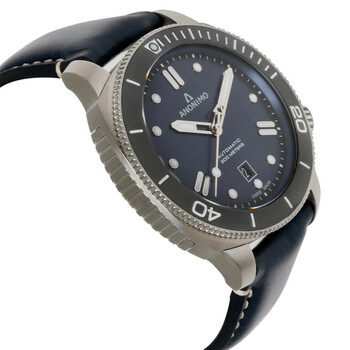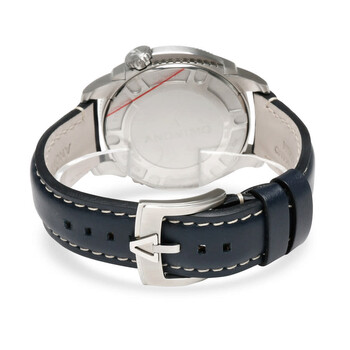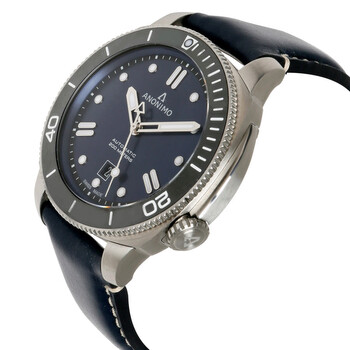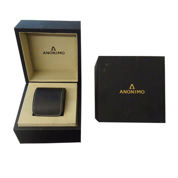 Silver-tone stainless steel case with a black leather strap. Black stainless steel bezel. Black dial with silver-tone hands and index hour markers. Minute markers around the outer rim. Dial Type: Analog. Luminescent hands and markers. Date display at the 6 o'clock position. Automatic movement. Scratch resistant sapphire crystal. Screw down crown. Solid case back. Round case shape, case size: 47 mm, case thickness: 12 mm. Band length: 8.00 inches. Buckle clasp. Water resistant at 200 meters / 660 feet. Functions: date, hour, minute, second. Dive watch style. Watch label: Swiss Made. Pre-owned Anonimo Nautilo Automatic Black Dial Men's Watch AM-1002-09.