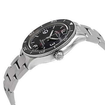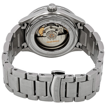 Silver-tone stainless steel case and bracelet. Uni-directional rotating silver-tone stainless steel with a black ring bezel. Black dial with luminous silver-tone hands and index hour markers. Arabic numerals amrk the 3, 6, 9 and 12 o'clock positions. Minute markers around the outer rim. Dial Type: Analog. Luminescent hands and markers. Date display between the 4 and 5 o'clock positions. Sellita Caliber SW200 Automatic movement, containing 26 Jewels, bitting at 28800 vph, and has a power reserve of approximately 38 hours. Scratch resistant sapphire crystal. Transparent case back. Round case shape, case size: 42 mm, case thickness: 13.5 mm. Band width: 22 mm. Fold over clasp with a push button release. Water resistant at 100 meters / 330 feet. Functions: date, hour, minute, second. M02-4 Series. Luxury watch style. Watch label: Swiss Made. Pre-owned Armand Nicolet M02-4 Automatic Black Dial Men's Watch A890ANA-NR-M2890A.