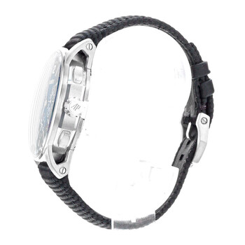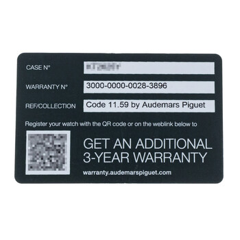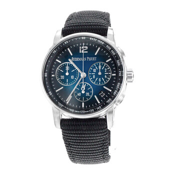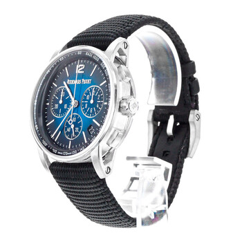 18kt white gold case with a black rubber strap. Fixed 18kt white gold bezel. Blue dial with silver-tone hands and index hour markers. Minute markers around the outer rim. Dial Type: Analog. Date display between 4 and 5 o'clock position. Chronograph - three sub-dials displaying: 60 second, 30 minute and 12 hour. Audemars Piguet Calibre 4401 Automatic movement, containing 40 Jewels, composed of 367 parts, bitting at 28800 vph, and has a power reserve of approximately 70 hours. Scratch resistant sapphire crystal. Transparent see through case back. Round case shape, case size: 41 mm. Buckle clasp. Water resistant at 30 meters / 100 feet. Functions: chronograph, column wheel, flyback, date, hour, minute, second. Code 11.59 Series. Luxury watch style. Watch label: Swiss Made. Pre-owned Audemars Piguet Code 11.59 Chronograph Automatic Blue Dial Men's Watch 26393BC.OO.A002KB.01.