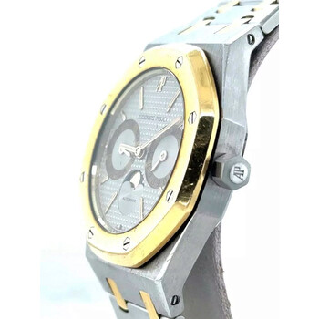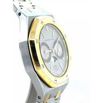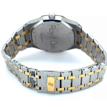 Silver-tone stainless steel case with a two-tone (silver-tone and yellow gold-tone) stainless steel and 18kt yellow gold bracelet. Fixed yellow gold-tone 18kt yellow gold bezel. Silver dial with yellow gold-tone hands and stick hour markers. Minute markers around the outer rim. Dial Type: Analog. Luminescent hands and markers. Day of the week and date sub-dials. Audemars Piguet Calibre 2224/2425 automatic movement with a 38-hour power reserve. Scratch resistant sapphire crystal. Screw down crown. Solid case back. Octagon case shape, case size: 36 mm. Deployment with push button release clasp. Water resistant at 50 meters / 165 feet. Functions: date, day, hour, minute, second, moonphase. Royal Oak Series. Luxury watch style. Watch label: Swiss Made. Pre-owned Audemars Piguet Royal Oak Automatic Silver Dial Men's Watch 25594SA.OO.0789SA.06.