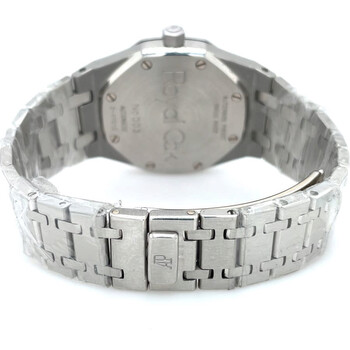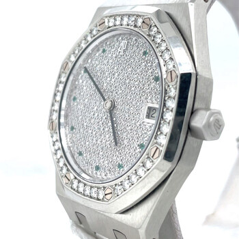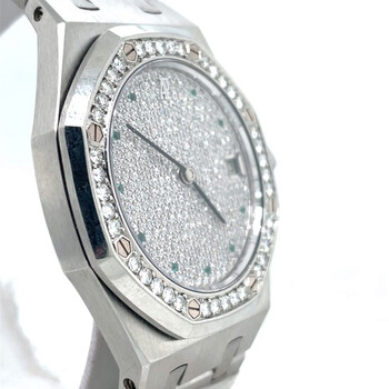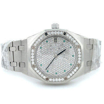 Silver-tone platinum case and bracelet. Fixed silver-tone bezel with diamond set platinum. Diamond dial with black hands and diamond hour markers. Dial Type: Analog. Date display at the 3 o'clock position. Automatic movement. Scratch resistant sapphire crystal. Screw down crown. Solid case back. Octagon case shape, case size: 36 mm, case thickness: 8 mm. Band width: 18 mm. Hidden clasp. Water resistant at 50 meters / 165 feet. Functions: date, hour, minute. Royal Oak Series. Luxury watch style. Watch label: Swiss Made. Pre-owned Audemars Piguet Royal Oak Diamond Diamond Dial Men's Watch 14813PT.ZZ.0789PT.01.