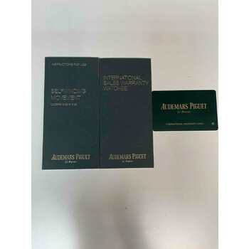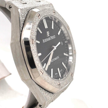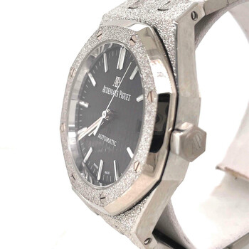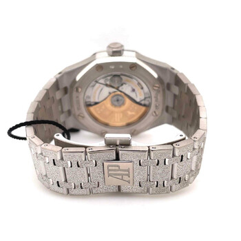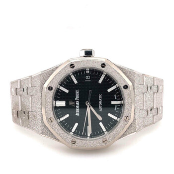 Pre-owned 18kt white gold case with a 18kt white gold bracelet. 8 screws fixed 18kt white gold bezel. Black with grande tapisserie pattern dial with silver-tone hands and index hour markers. Minute markers around the outer rim. Dial Type: Analog. Luminescent hands and markers. Date display at the o'clock position. Audemars Piguet Calibre 3120 Automatic movement, containing 40 Jewels, composed of 280 parts, bitting at 21600 vph, and has a power reserve of approximately 60 hours. Scratch resistant sapphire crystal. Screw down crown. Octagon case shape, case size: 37 mm, case thickness: 9.8 mm. Folding clasp. Water resistant at 50 meters / 165 feet. Functions: date, hour, minute. Luxury watch style. Watch label: Swiss Made. Audemars Piguet Royal Oak Frosted Gold Black Dial Ladies 18k White Gold Watch 15454BC.GG.1259BC.03.