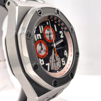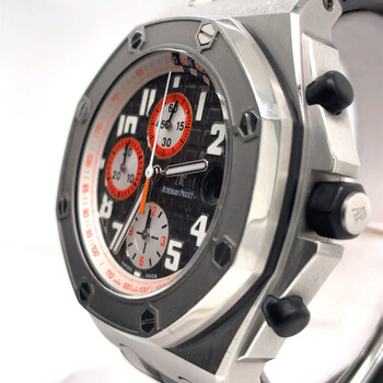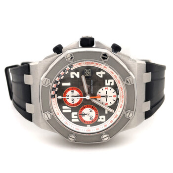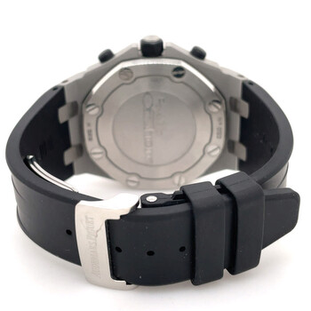 Pre-owned Stainless steel case with a black leather strap. Fixed bezel. Grey dial with luminous hands and Arabic hour markers. Tachymeter scale appears around the outer rim. Dial Type: Analog. Date display at the 3 o'clock position. Chronograph - three sub-dials displaying: 12- hours, 30- minutes and 60- seconds. Audemars Piguet Calibre 3126/3840 Automatic movement, based upon Audemars Piguet 3120, containing 59 Jewels, composed of 365 parts, bitting at 21600 vph, and has a power reserve of approximately 50 hours. Scratch resistant sapphire crystal. Solid case back. Octagon case shape. Case size: 54 mm x 42 mm. Fold over with push button release clasp. Water resistant at 100 meters / 330 feet. Functions: chronograph, date, hour, minute, small second. Sport watch style. Watch label: Swiss Made. Item Variations: 26175ST OO D003CU 01, 26175ST-OO-D003CU-01, 26175STOOD003CU01. Audemars Piguet Royal Oak Grey Dial Chronograph Men's Watch 26175ST.OO.D003CU.01.