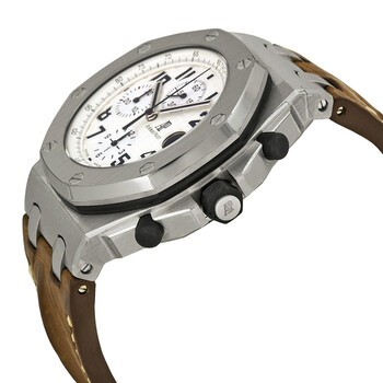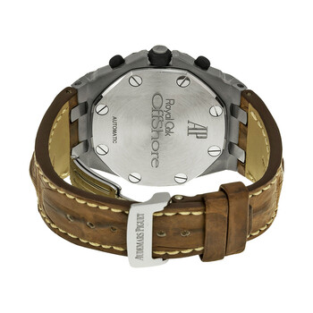Pre-owned Silver-tone stainless steel case with a brown (hornback) leather strap. Fixed silver-tone stainless steel bezel. Silver (waffle design) dial with black hands and Arabic numeral hour markers. Tachymeter scale appears around the outer rim. Dial Type: Analog. Luminescent hands and markers. Date display at the 3 o'clock position. Chronograph - three sub-dials displaying: 60 second, 30 minute and 12 hour. Audemars Piguet Calibre 3126/3840 Automatic movement, based upon Audemars Piguet 3120, containing 59 Jewels, composed of 365 parts, bitting at 21600 vph, and has a power reserve of approximately 50 hours. Scratch resistant sapphire crystal. Screw down black rubber clad crown. Solid case back. Octagon case shape, case size: 54 mm x 42 mm, case thickness: 14.2 mm. Band width: 20.3 mm, band length: 8 inches. Deployment clasp. Water resistant at 100 meters / 330 feet. Functions: chronograph, date, hour, minute, small second. Sport watch style. Watch label: Swiss Made. Item Variations: 26170ST OO D091CR 01, 26170ST-OO-D091CR-01, 26170STOOD091CR01. Audemars Piguet Royal Oak Offshore Chronograph Men's Watch 26170ST-OO-D091CR-01.