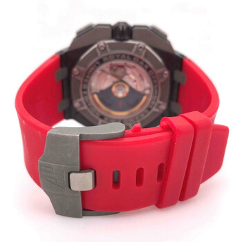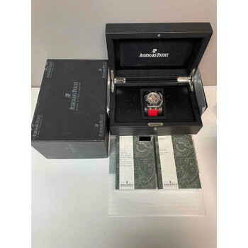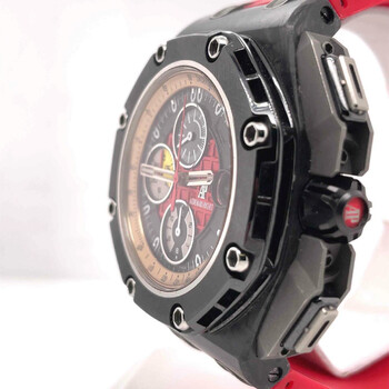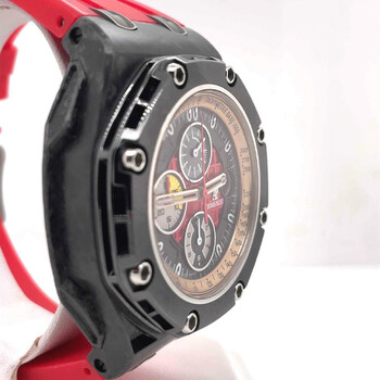Pre-owned Forged carbon case with a black leather strap. 8 screws fixed black bezel. Black dial with skeleton hands and index hour markers. Tachymeter scale appears around the outer rim. Dial Type: Analog. Date display at the 3 o'clock position. Chronograph - three sub-dials displaying: 12- hours, 30- minutes and 60- seconds. Audemars Piguet Calibre 3126/3840 Automatic movement, based upon Audemars Piguet 3120, containing 59 Jewels, composed of 365 parts, bitting at 21600 vph, and has a power reserve of approximately 50 hours. Scratch resistant sapphire crystal. Screw down crown. Skeleton transparent case back. Octagon case shape, case size: 56 mm x 44 mm, case thickness: 15.7 mm. Tang clasp. Water resistant at 100 meters / 330 feet. Functions: chronograph, date, hour, minute, small second. Royal Oak Offshore Grand Prix Series. Luxury watch style. Watch label: Swiss Made. Item Variations: 26290IO OO A001VE 01, 26290IO-OO-A001VE-01, 26290IOOOA001VE01. Audemars Piguet Royal Oak Offshore Grand Prix Men's Watch 26290IOOOA001VE01.