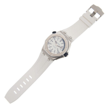 Silver-tone stainless steel case with a white rubber strap. 8 screws fixed silver-tone bezel. White with mega tapisserie pattern dial with silver-tone hands and index hour markers. Minute markers around the outer rim. Dial Type: Analog. Luminescent hands and markers. Date display at the 3 o'clock position. Audemars Piguet Calibre 3120 Automatic movement, containing 40 Jewels, composed of 280 parts, bitting at 21600 vph, and has a power reserve of approximately 60 hours. Scratch resistant sapphire crystal. Screw down crown. Transparent case back. Octagon case shape, case size: 42 mm, case thickness: 14.1 mm. Pin buckle clasp. Water resistant at 300 meters / 1000 feet. Functions: date, hour, minute, second. Royal Oak Offshore Series. Luxury watch style. Watch label: Swiss Made. Pre-owned Audemars Piguet Royal Oak Offshore White with Mega Tapisserie pattern Dial Men's Watch 15710ST.OO.A010CA.01.