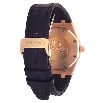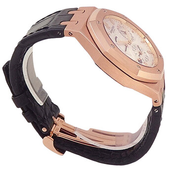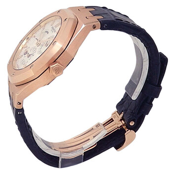 Rose gold-tone 18kt rose gold case with a black leather strap. 8 screws fixed rose gold-tone 18kt rose gold bezel. White guilloche dial with rose gold-tone hands and index hour markers. Minute markers around the outer rim. Dial Type: Analog. Luminescent hands and dial markers. Date. Three sub-dials displaying: date, 12 hour and power reserve indicator. Audemars Piguet Calibre 2329/2846 Automatic movement, containing 33 Jewels, bitting at 28800 vph, and has a power reserve of approximately 38 hours. Scratch resistant sapphire crystal. Screw down crown. Solid, 18k rose gold case back. Octagon case shape, case size: 39 mm, case thickness: 10.3 mm. Folding clasp. Water resistant at 50 meters / 165 feet. Functions: second time zone, date, hour, minute, power reserve indicator, day/night indicator. Royal Oak Series. Luxury watch style. Watch label: Swiss Made. Pre-owned Audemars Piguet Royal Oak White Guilloche Dial Men's Watch 26120OR.OO.D088CR.01.