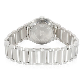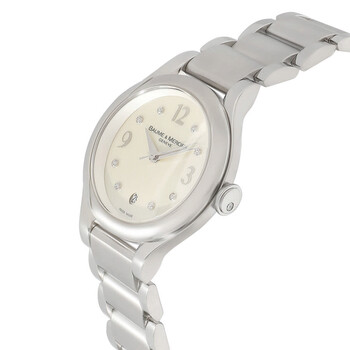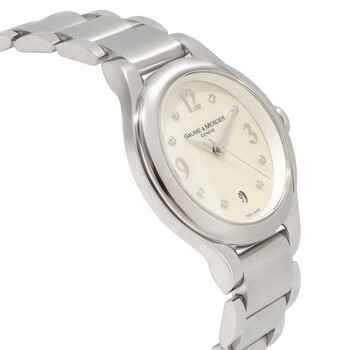Silver-tone stainless steel case and bracelet. Fixed silver-tone stainless steel bezel. White dial with silver-tone hands and diamond hour markers. Dial Type: Analog. Date display at the 6 o'clock position. Quartz movement. Scratch resistant sapphire crystal. Solid case back. Round case shape, case size: 30 mm, case thickness: 9.50 mm. Band width: 15.5 mm, band length: 6.75 inches. Fold over clasp with a safety release. Water resistant at 30 meters / 100 feet. Functions: date, hour, minute, second. Ilea Series. Sport watch style. Watch label: Swiss Made. Item Variations: MOA8769, M0A08769, 8769, 08769. Pre-owned Baume et Mercier Ilea Quartz Diamond White Dial Ladies Watch M0A08769.