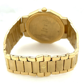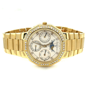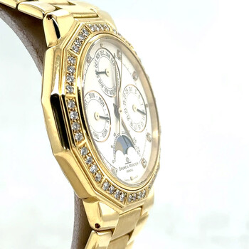 Yellow gold-tone 18kt yellow gold case and bracelet. Fixed yellow gold-tone bezel with diamond set 18kt yellow gold. Beige dial with yellow gold-tone hands and diamond hour markers. Minute markers around the outer rim. Dial Type: Analog. Day / date / month. Quartz movement. Scratch resistant sapphire crystal. Screw down crown. Solid case back. Round case shape, case size: 34 mm, case thickness: 7 mm. Band width: 20 mm. Hidden clasp. Water resistant at 30 meters / 100 feet. Functions: hour, minute, second, perpetual calendar, day, month, moon-phase, water resistant. Riveira Series. Luxury watch style. Watch label: Swiss Made. Pre-owned Baume et Mercier Riveira Perpetual Quartz Diamond Unisex Watch 87112.9.