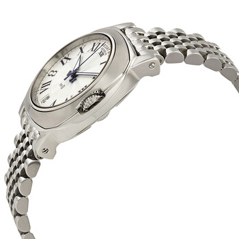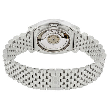Stainless steel case with a stainless steel bracelet. Fixed bezel. Silver dial with blue-toned hands and Roman numeral hour markers. Minute markers around the outer rim. Dial Type: Analog. Date display at the 6 o'clock position. ETA Calibre 11 1/2 2892-A2 automatic movement with about 42 hours of power reserve. Scratch resistant sapphire crystal. Integrated within the caseband crown. See through case back. Case size: 34 mm. Case thickness: 10 mm. Cushion case shape. Deployment clasp. Water resistant at 50 meters / 165 feet. Functions: date, hour, minute, second. Luxury watch style. Watch label: Swiss A.O.S.C. Item Variations: 838 011 100, 838-011-100, 838/011/100, 838011100. Bedat No 8 Silver Dial Stainless Steel Automatic Ladies Watch 838.011.100.