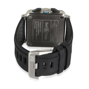 Silver-tone stainless steel case with a black rubber strap. Black stainless steel bezel. Black dial with silver-tone hands and Arabic numeral hour markers. Minute markers around the outer rim. Dial Type: Analog. Luminescent hands and markers. Date display at the 6 o'clock position. Chronograph - two sub-dials displaying: 60 second and 30 minute. Automatic movement. Scratch resistant sapphire crystal. Solid case back. Square case shape, case size: 42 mm, case thickness: 12.50 mm. Band width: 24 mm, band length: 7.50 inches. Buckle clasp. Water resistant at 100 meters / 330 feet. Functions: chronograph, date, hour, minute, second. Aviation Series. Sport watch style. Watch label: Swiss Made. Pre-owned Bell and Ross Aviation Chronograph Automatic Black Dial Men's Watch BR 03-94-A521.