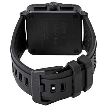 Ceramic black case with a black (perforated) rubber strap. Fixed black ceramic bezel. Black dial with luminous black hands and Arabic numeral hour markers. Minute markers. Tachymeter markings around the outer rim. Dial Type: Analog. Luminescent hands and markers. Date display at the 6 o'clock position. Chronograph - two sub-dials displaying: 60 second and 30 minute. Bell and Ross Calibre BR-CAL.301 Automatic movement, based upon ETA 2894-2, containing 37 Jewels, bitting at 28800 vph, and has a power reserve of approximately 42 hours. Scratch resistant sapphire crystal. Pull / push crown. Solid case back. Square case shape, case size: 42 mm, case thickness: 12.6mm. Tang clasp. Water resistant at 100 meters / 330 feet. Functions: chronograph, tachymeter,date, hour, minute, second. Additional Info: additional ultra-resilient black synthetic fabric strap. Br03-94 Series. Luxury watch style. Watch label: Swiss Made. Bell and Ross BR03-94 Chronograph Automatic Black Dial Watch BR0394-RS20/SRB.