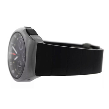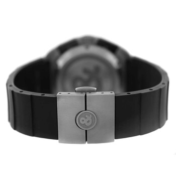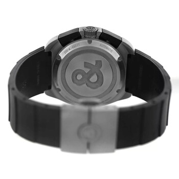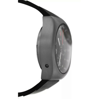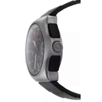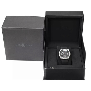 Grey titanium case with a black rubber strap. Fixed grey titanium bezel. Black dial with silver-tone hands and Arabic numeral & index hour markers. Minute markers around the outer rim. Dial Type: Analog. Luminescent hands and markers. Date display at the 3 o'clock position. Automatic movement. Solid case back. Round case shape, case size: 41 mm. Deployment with push button release clasp. Water resistant at 200 meters / 660 feet. Functions: chronograph, date, hour, minute, second. Space 3 Series. Casual watch style. Watch label: Swiss Made. Pre-owned Bell and Ross Space 3 Chronograph Automatic Black Dial Men's Watch 324-T.