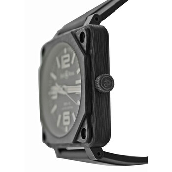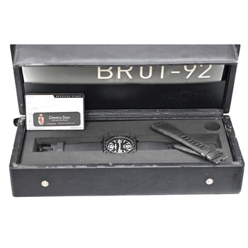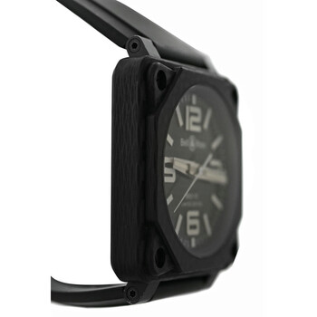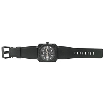 Black polycarbonate case with a black rubber strap. Fixed black polycarbonate bezel. Black dial with silver-tone hands and Arabic numeral & index hour markers. Minute markers around the outer rim. Dial Type: Analog. Luminescent hands and markers. Automatic movement. Scratch resistant sapphire crystal. Square case shape, case size: 46 mm. Band length: 8 inches. Buckle clasp. Functions: hour, minute, second. Aviation Series. Casual watch style. Watch label: Swiss Made. Item Variations: BR01-92. Pre-owned Bell Ross Aviation Automatic Black Dial Men's Watch BR01-92-C-369/500.