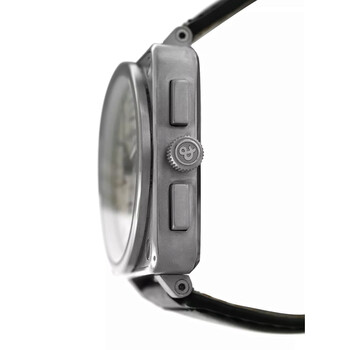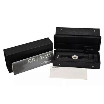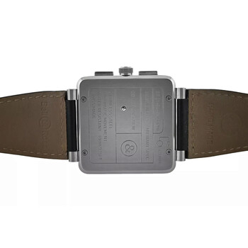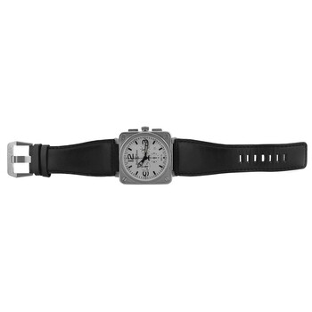Silver-tone stainless steel case with a black leather strap. Fixed silver-tone stainless steel bezel. Silver-tone dial with black hands and Arabic numeral & index hour markers. Minute markers around the outer rim. Dial Type: Analog. Luminescent hands and markers. Date display between 4 and 5 o'clock position. Chronograph - three sub-dials displaying: 60 second, 30 minute and 12 hour. Automatic movement. Scratch resistant sapphire crystal. Solid case back. Square case shape, case size: 46 mm. Band length: 8.75 inches. Buckle clasp. Water resistant at 100 meters / 330 feet. Functions: chronograph, date, hour, minute, second. Aviation Type Series. Luxury watch style. Watch label: Swiss Made. Item Variations: BR01-94. Pre-owned Bell Ross Aviation Type Chronograph Automatic Silver Dial Men's Watch BR01-94-S.