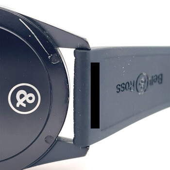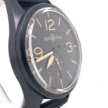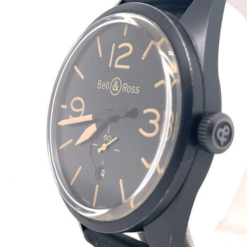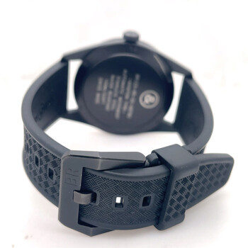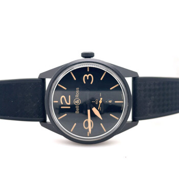 Black stainless steel case with a black rubber strap. Fixed black stainless steel bezel. Black dial with black hands and Arabic & index hour markers. Dial Type: Analog. Luminescent hands and markers. Date display at the 6 o'clock position. Automatic movement. Scratch resistant sapphire crystal. Pull / push crown. Solid case back. Round case shape, case size: 41 mm, case thickness: 12 mm. Band width: 21 mm. Buckle clasp. Water resistant at 100 meters / 330 feet. Functions: date, hour, minute, second, water resistant. Vintage Series. Casual watch style. Watch label: Swiss Made. Pre-owned Bell Ross Vintage Automatic Black Dial Men's Watch BR123-95-SC.