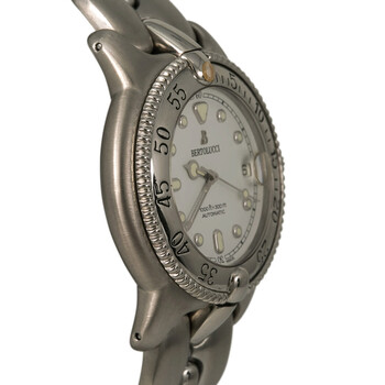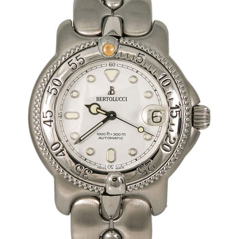 Silver-tone stainless steel case and bracelet. Bi-directional rotating silver-tone stainless steel bezel. White dial with silver-tone hands and index hour markers. Minute markers around the outer rim. Dial Type: Analog. Luminescent hands and markers. Date display at the 3 o'clock position. Automatic movement. Scratch resistant sapphire crystal. Screw down crown. Solid case back. Round case shape, case size: 36 mm, case thickness: 12 mm. Band width: 19 mm, band length: 7 inches. Hidden clasp. Water resistant at 300 meters / 1000 feet. Functions: hour, minute, second, date. Maris Series. Luxury watch style. Watch label: Swiss Made. Pre-owned Bertolucci Maris Automatic White Dial Men's Watch 6298055.
