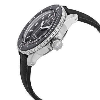 Pre-owned Stainless steel case with a black sail canvas strap. Uni-directional rotating coin edge stainless steel bezel with a black (sapphire coated) top ring. Black dial with luminous silver-tone hands and index hour markers. Arabic numerals mark the 3, 6, 9, and 12 o'clock positions. Minute markers around the outer rim. Dial Type: Analog. Luminescent hands and markers. Date display between the 4 and 5 o'clock positions. Blancpain calibre 1315 automatic movement, containing 35 Jewels, composed of 227 parts, and has a power reserve of approximately 120 hours. Scratch resistant sapphire crystal. Screw down crown. Solid case back. Round case shape. Case size: 45 mm. Case thickness: 15.5 mm. Band width: 23 mm. Tang clasp. Water resistant at 300 meters / 1000 feet. Functions: date, hour, minute, second. Fifty Fathoms Automatique Series. Luxury watch style. Watch label: Swiss Made. Blancpain Fifty Fathoms Automatique Black Dial Men's Watch 5015-1130-52A.