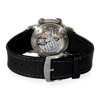 Pre-owned Grey titanium case with a brown barennia lined with rubber strap. Fixed grey titanium bezel. Black dial with silver-tone hands and index- Arabic numerals hour markers. Minute markers around the outer rim. Dial Type: Analog. Luminescent hands and markers. Date display between 4 and 5 o'clock position. Five subdials - 24 hour, 12 hour/60 second, power reserve indicator, alarm. Blancpain Calibre 1241 Automatic movement, containing 38 Jewels, composed of 405 parts, and has a power reserve of approximately 40 hours. Scratch resistant sapphire crystal. Skeleton transparent exhibition see through case back. Round case shape, case size: 40 mm, case thickness: 13.3 mm. Band width: 22 mm. Water resistant at 100 meters / 330 feet. Functions: alarm, date, GMT, two time zone, hours, minutes, seconds, power reserve indicator. Leman Gmt Series. Luxury watch style. Watch label: Swiss Made. Blancpain Leman GMT Automatic Men's Watch 2041-1230-63B.