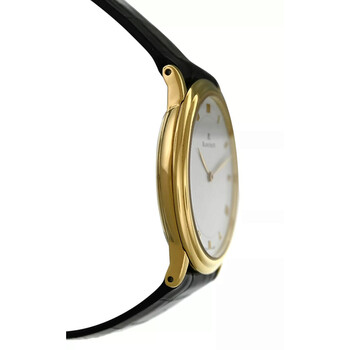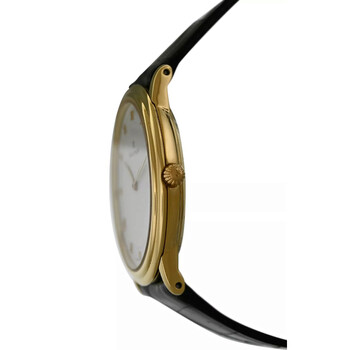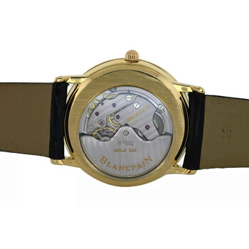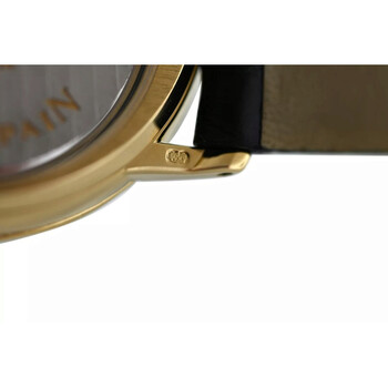 Yellow gold-tone 18kt yellow gold case with a black leather strap. Fixed yellow gold-tone 18kt yellow gold bezel. White dial with yellow gold-tone hands and Roman numeral & index hour markers. Dial Type: Analog. Automatic movement. Scratch resistant sapphire crystal. Transparent see through case back. Round case shape, case size: 33 mm. Buckle clasp. Functions: hour, minute. Villeret Series. Luxury watch style. Watch label: Swiss Made. Pre-owned Blancpain Villeret Automatic White Dial Men's Watch 0071-1418.