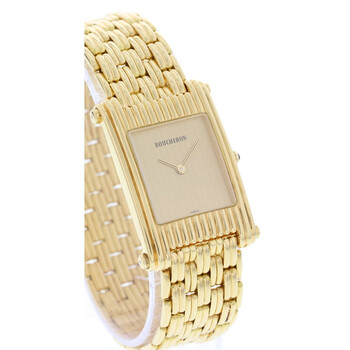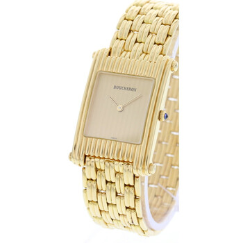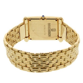 Gold-tone gold case with a gold-tone gold bracelet. Fixed gold-tone bezel. Gold tone dial with gold-tone hands. Dial Type: Analog. Quartz movement. Scratch resistant sapphire crystal. Screw down crown. Solid case back. Rectangle case shape. Case size: 24 mm. Band length: 7.5 inches. Hidden clasp. Water resistant at 100 meters / 330 feet. Functions: hour, minute. Luxury watch style. Watch label: Swiss Made. Pre-owned Boucheron Reflet Gold Tone Dial Men's Watch A256 / 2174.