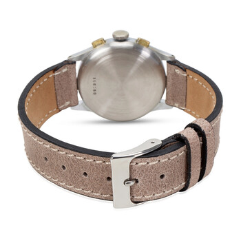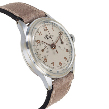 Silver-tone stainless steel case with a leather strap. Fixed silver-tone stainless steel bezel. Grey dial with Arabic numeral hour markers. Minute markers around the outer rim. Dial Type: Analog. Two - 60 minutes, 30 minutes subdials. Hand wind movement. Scratch resistant acrylic crystal. Pull / push crown. Solid case back. Round case shape, case size: 33 mm, case thickness: 10 mm. Band width: 18 mm, band length: 8 inches. Tang clasp. Functions: hour, minute, second. Sport watch style. Watch label: Swiss Made. Pre-owned Bovet Chrono Grey Dial Watch Bovet. Box: No ,Paper: No