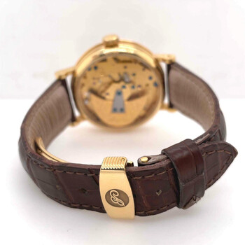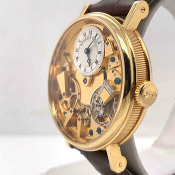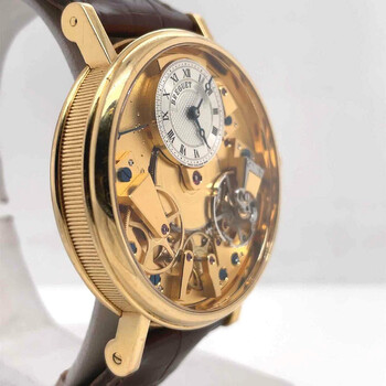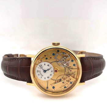 Pre-owned 18kt yellow gold case with a brown leather strap. Fixed bezel. Champagne dial with blue-toned hands and Roman numeral hour markers. Minute markers around the outer rim. Dial Type: Analog. Automatic movement. Scratch resistant sapphire crystal. Pull / push crown. Case diameter: 37 mm. Case thickness: 11.8 mm. Round case shape. Tang clasp. Water resistant at 30 meters / 100 feet. Functions: hour, minute, second. Luxury watch style. Breguet Tradition Champagne Dial 18kt Yellow Gold Brown Leather Men's Watch 7037BA119V6.