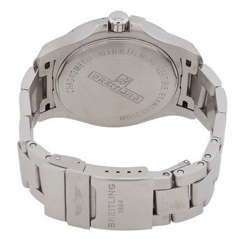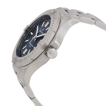 Silver-tone brushed stainless steel case and bracelet. Uni-directional rotating silver-tone bezel. Blue dial with silver-tone hands and index hour markers. Minute markers around the outer rim. Dial Type: Analog. Luminescent hands and markers. Date display at the 3 o'clock position. Breitling Calibre 17 Automatic movement, based upon ETA 2824-2, containing 25 Jewels, bitting at 28800 vph, and has a power reserve of approximately 42 hours. Scratch resistant sapphire crystal. Screw down crown. Solid case back. Round case shape, case size: 44 mm. Band length: 7 1/4 inches. Deployment clasp. Water resistant at 200 meters / 660 feet. Functions: date, hour, minute, second, chronometer. Luxury watch style. Watch label: Swiss Made. Pre-owned Breitling Automatic Chronometer Blue Dial Men's Watch A1738810-CA06-173A.