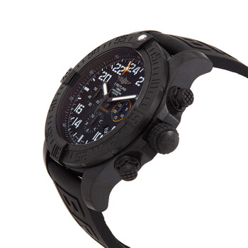 Pre-owned Black ultralight polymer (Breitlight) case with a black rubber strap. Uni-directional rotating black ultralight polymer (Breitlight) bezel. Black dial with luminous grey hands and Arabic numeral (24 hour scale) hour markers. Minute markers. 1/100th markers around the outer rim. Dial Type: Analog. Luminescent hands and markers. Date display between the 4 and 5 o'clock positions. Chronograph - three sub-dials displaying: 60 second, 30 minute and 12 hour. Breitling calibre B12 automatic movement, containing 47 Jewels, bitting at 28800 vph, and has a power reserve of approximately 70 hours. Scratch resistant sapphire crystal. Screw down crown. Solid case back. Round case shape. Case size: 50 mm. Case thickness: 16.97 mm. Band width: 24 mm. Tang clasp. Water resistant at 100 meters / 330 feet. Functions: chronograph, column wheel, date, hour, minute, small second, chronometer. Avenger Hurricane Series. Sport watch style. Watch label: Swiss Made. Breitling Avenger Hurricane Chronograph Automatic Black Dial 50 mm Men's Watch XB1210E41B1S2.
