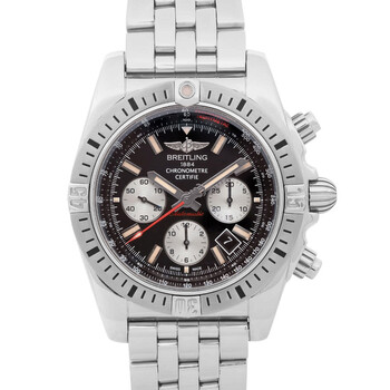 Silver-tone stainless steel case and bracelet. Uni-directional rotating silver-tone stainless steel bezel. Black dial with silver-tone hands and index hour markers. Minute markers around the outer rim. Dial Type: Analog. Luminescent hands. Date display between 4 and 5 o'clock position. Chronograph - three sub-dials displaying: 60 second, 30 minute and 12 hour. Breitling Calibre 01 Automatic movement, containing 47 Jewels, composed of 346 parts, bitting at 28800 vph, and has a power reserve of approximately 70 hours. Screw down crown. Solid case back. Round case shape, case size: 44 mm, case thickness: 17 mm. Band width: 20 mm, band length: 8.25 inches. Fold over clasp with a safety release. Water resistant at 500 meters / 1650 feet. Functions: chronograph, column wheel, date, hour, minute, second, chronometer. Breitling Chronomat 44 Airborne Series. Luxury watch style. Watch label: Swiss Made. Pre-owned Breitling Breitling Chronomat 44 Airborne Chronograph Automatic Chronometer Black Dial Men's Watch AB01154G/BD13-375A.