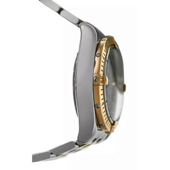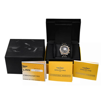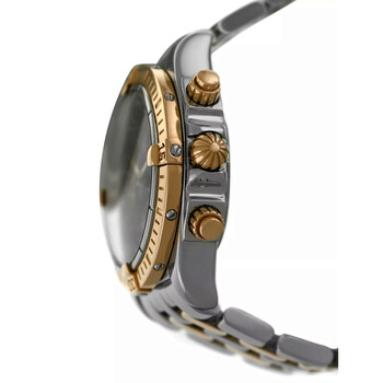Silver-tone stainless steel case with a two-tone (silver-tone and rose gold-tone) 18kt rose gold and stainless steel bracelet. Uni-directional rotating rose gold-tone 18kt rose gold bezel. Black dial with rose gold-tone hands and Arabic numeral & index hour markers. Minute markers around the outer rim. Dial Type: Analog. Luminescent hands and markers. Date display at the 3 o'clock position. Chronograph - three sub-dials displaying: 60 second, 30 minute and 12 hour. Breitling Calibre 13 Automatic movement, based upon ETA Valjoux 7750, containing 25 Jewels, bitting at 28800 vph, and has a power reserve of approximately 42 hours. Scratch resistant sapphire crystal. Screw down crown. Solid case back. Round case shape, case size: 44 mm. Fold over clasp with a safety release. Water resistant at 300 meters / 1000 feet. Functions: chronograph, date, hour, minute, second, chronometer. C13356 Series. Dive watch style. Watch label: Swiss Made. Pre-owned Breitling C13356 Chronograph Automatic Chronometer Black Dial Men's Watch C13356.