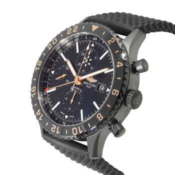 Black stainless steel case with a black rubber strap. Bi-directional rotating black stainless steel bezel. Black dial with rose gold-tone hands and index hour markers. Minute markers around the outer rim. Dial Type: Analog. Luminescent hands and markers. Date display at the 3 o'clock position. Chronograph - three sub-dials displaying: 60 second, 30 minute and 12 hour. Breitling Calibre 24 Automatic movement, based upon ETA 7754, containing 25 Jewels, bitting at 28800 vph, and has a power reserve of approximately 42 hours. Scratch resistant sapphire crystal. Screw down crown. Solid case back. Round case shape, case size: 46 mm, case thickness: 15.80 mm. Band width: 24 mm, band length: 6.50 inches. Deployment with push button release clasp. Water resistant at 100 meters / 330 feet. Functions: chronograph, GMT, second time zone, hour, minute, small second, chronometer. Additional Info: includes box, papers, instructions. Chronoliner Series. Sport watch style. Watch label: Swiss Made. Pre-owned Breitling Chronoliner Chronograph GMT Automatic Chronometer Black Dial Men's Watch M24310.