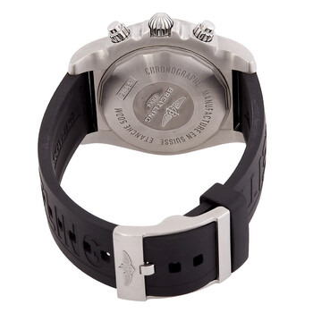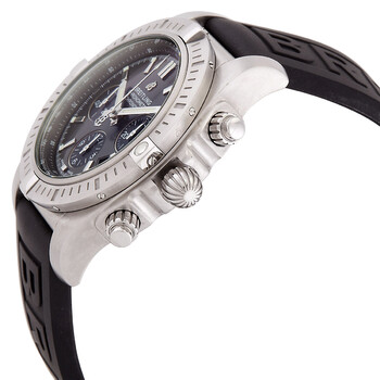 . Silver-tone stainless steel case with a black rubber strap. Uni-directional rotating silver-tone stainless steel bezel. Grey dial with luminous silver-tone hands and index hour markers. Minute markers. 1/100th second markers. Tachymeter markers around the outer rim. Dial Type: Analog. Luminescent hands and markers. Date display between the 4 and 5 o'clock positions. Chronograph - three sub-dials displaying: 60 second, 30 minute and 12 hour. Breitling Calibre 01 Automatic movement, containing 47 Jewels, composed of 346 parts, bitting at 28800 vph, and has a power reserve of approximately 70 hours. Scratch resistant sapphire crystal. Screw locked crown. Solid case back. Round case shape, case size: 44 mm, case thickness: 16.95 mm. Band width: 22 mm. Fold over clasp with a push button release. Water resistant at 500 meters / 1650 feet. Functions: chronograph, column wheel, date, hour, minute, second, chronometer. Chronomat B01 Series. Dive watch style. Watch label: Swiss Made. Pre-owned Breitling Chronomat B01 Chronograph Automatic Grey Dial Men's Watch AB0115101F1P2.