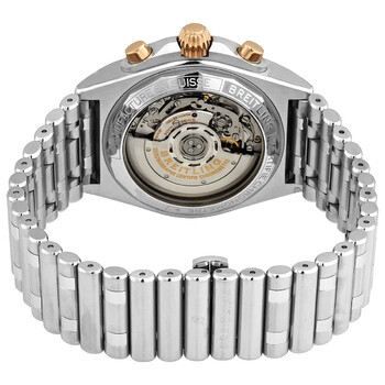Pre-owned Stainless steel case with a stainless steel bracelet. Uni-directional rotating stainless steel with 18kt rose gold rider tabs bezel. Silver dial with luminous rose gold-tone hands and index hour markers. Minute markers. 1/100th second markers. Tachymeter markers around the outer rim. Dial Type: Analog. Luminescent hands and markers. Date display above the 6 o'clock position. Chronograph - three sub-dials displaying: 60 second, 30 minute and 12 hour. Breitling calibre 01 Automatic movement, containing 47 Jewels, composed of 346 parts, bitting at 28800 vph, and has a power reserve of approximately 70 hours. Scratch resistant sapphire crystal. Screw locked crown. Transparent case back. Round case shape. Case size: 42 mm. Case thickness: 15.1 mm. Band width: 22 mm. Fold over clasp with a push button release. Water resistant at 200 meters / 660 feet. Functions: chronograph, tachymeter, date, hour, minute, second. Chronomat B01 Series. Luxury watch style. Watch label: Swiss Made. Breitling Chronomat B01 Chronograph Automatic Silver Dial Men's Watch IB0134101G1A1.