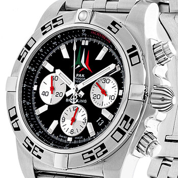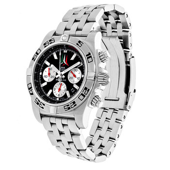Silver-tone stainless steel case and bracelet. Uni-directional rotating silver-tone stainless steel bezel. Black dial with silver-tone hands and index hour markers. Minute markers around the outer rim. Dial Type: Analog. Luminescent hands and markers. Date display between 4 and 5 o'clock position. Chronograph - three sub-dials displaying: 60 second, 30 minute and 12 hour. Breitling Calibre 01 Automatic movement, containing 47 Jewels, composed of 346 parts, bitting at 28800 vph, and has a power reserve of approximately 70 hours. Scratch resistant sapphire crystal. Screw down crown. Solid case back. Round case shape, case size: 44 mm. Fold over clasp with a safety release. Water resistant at 500 meters / 1650 feet. Functions: chronograph, column wheel, date, hour, minute, second, chronometer. Chronomat Series. Dive watch style. Watch label: Swiss Made. Pre-owned Breitling Chronomat Chronograph Automatic Chronometer Black Dial Men's Watch AB01104D-BC62-377A.