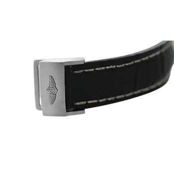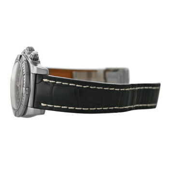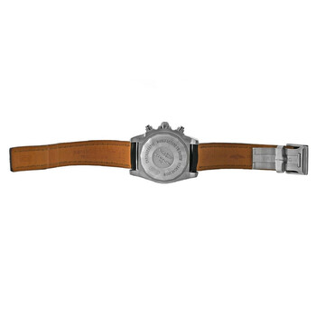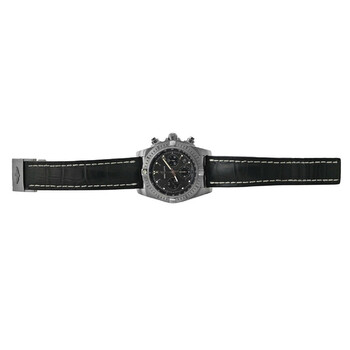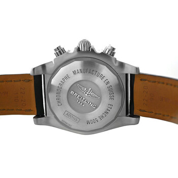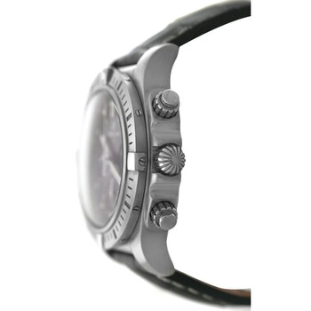 Silver-tone stainless steel case with a black leather strap. Uni-directional rotating silver-tone stainless steel bezel. Black dial with silver-tone hands and Arabic numeral hour markers. Minute markers around the outer rim. Dial Type: Analog. Luminescent hands and markers. Date display between 4 and 5 o'clock position. Chronograph - three sub-dials displaying: 60 second, 30 minute and 12 hour. Breitling Calibre 01 Automatic movement, containing 47 Jewels, composed of 346 parts, bitting at 28800 vph, and has a power reserve of approximately 70 hours. Screw down crown. Solid case back. Round case shape, case size: 44 mm. Fold over clasp with a safety release. Water resistant at 500 meters / 1650 feet. Functions: chronograph, column wheel, date, hour, minute, second, chronometer. Chronomat Series. Dive watch style. Watch label: Swiss Made. Pre-owned Breitling Chronomat Chronograph Automatic Chronometer Black Dial Men's Watch AB0115.