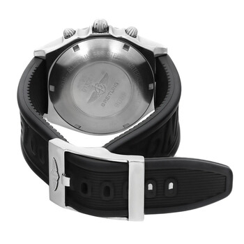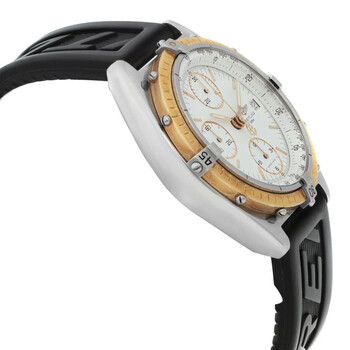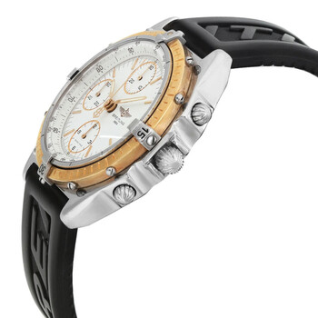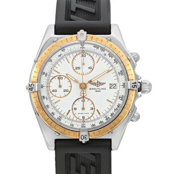 Silver-tone stainless steel case with a black rubber strap. Uni-directional rotating yellow gold-tone bezel. White dial with gold-tone hands and index hour markers. Minute markers around the outer rim. Dial Type: Analog. Luminescent hands. Date display at the 3 o'clock position. Chronograph - three sub-dials displaying: 60 second, 30 minute and 12 hour. Breitling Calibre 13 Automatic movement, based upon ETA Valjoux 7750, containing 25 Jewels, bitting at 28800 vph, and has a power reserve of approximately 42 hours. Screw down crown. Solid case back. Round case shape, case size: 38 mm, case thickness: 14 mm. Band width: 18 mm, band length: 7.5 inches. Buckle clasp. Water resistant at 30 meters / 100 feet. Functions: chronograph, date, hour, minute, second, chronometer. Chronomat Series. Casual watch style. Watch label: Swiss Made. Pre-owned Breitling Chronomat Chronograph Automatic Chronometer White Dial Men's Watch D13047.