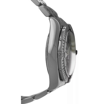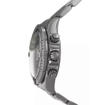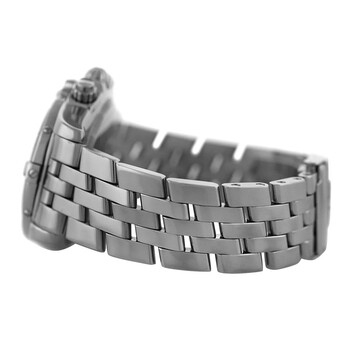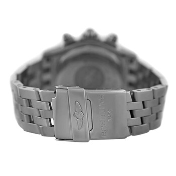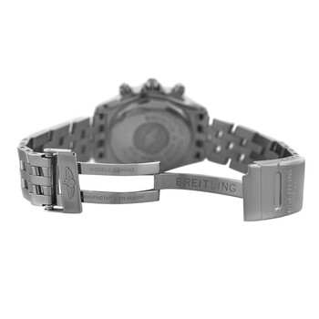 Silver-tone stainless steel case and bracelet. Uni-directional rotating silver-tone stainless steel bezel. Blue dial with silver-tone hands and Arabic numeral & index hour markers. Minute markers around the outer rim. Dial Type: Analog. Luminescent hands and markers. Date display at the 3 o'clock position. Chronograph - three sub-dials displaying: 60 second, 30 minute and 12 hour. Breitling Calibre 13 Automatic movement, based upon ETA Valjoux 7750, containing 25 Jewels, bitting at 28800 vph, and has a power reserve of approximately 42 hours. Scratch resistant sapphire crystal. Screw down crown. Solid case back. Round case shape, case size: 42 mm. Fold over clasp with a safety release. Water resistant at 300 meters / 1000 feet. Functions: chronograph, date, hour, minute, second, chronometer. Chronomat Evolution Series. Dive watch style. Watch label: Swiss Made. Pre-owned Breitling Chronomat Evolution Chronograph Automatic Chronometer Blue Dial Men's Watch A13356.