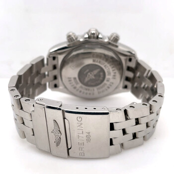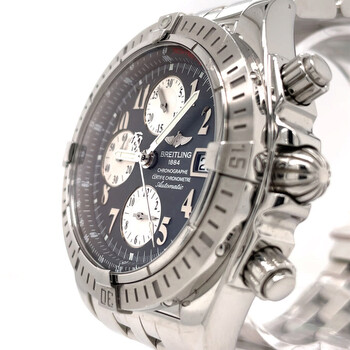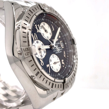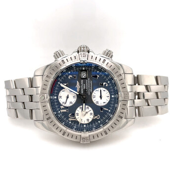 Silver-tone stainless steel case and bracelet. Uni-directional rotating silver-tone stainless steel bezel. Grey dial with silver-tone hands and Arabic numeral hour markers. Minute markers around the outer rim. Dial Type: Analog. Luminescent hands and markers. Date display at the 3 o'clock position. Chronograph - three sub-dials displaying: 60 second, 30 minute and 12 hour. Breitling Calibre 13 Automatic movement, based upon ETA Valjoux 7750, containing 25 Jewels, bitting at 28800 vph, and has a power reserve of approximately 42 hours. Scratch resistant sapphire crystal. Screw down crown. Solid case back. Round case shape, case size: 43 mm, case thickness: 17 mm. Band width: 20 mm. Fold over clasp with a safety release. Water resistant at 300 meters / 1000 feet. Functions: chronograph, date, hour, minute, second, chronometer. Chronomat Evolution Series. Luxury watch style. Watch label: Swiss Made. Pre-owned Breitling Chronomat Evolution Chronograph Automatic Chronometer Grey Dial Men's Watch A1335611C647.
