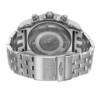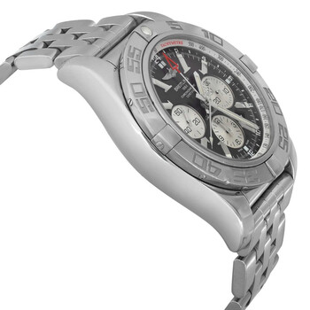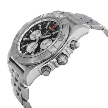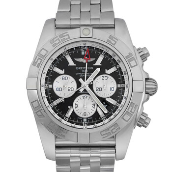 Silver-tone stainless steel case and bracelet. Uni-directional rotating silver-tone stainless steel bezel. Black dial with silver-tone hands and index hour markers. Minute markers around the outer rim. Dial Type: Analog. Luminescent hands and markers. Date display between 4 and 5 o'clock position. Chronograph - three sub-dials displaying: 60 second, 30 minute and 12 hour. Breitling Calibre 04 Automatic movement, based upon Breitling Calibre 01, containing 47 Jewels, bitting at 28000 vph, and has a power reserve of approximately 70 hours. Scratch resistant sapphire crystal. Screw down crown. Solid case back. Round case shape, case size: 47 mm, case thickness: 18 mm. Band width: 20 mm, band length: 7.5 inches. Fold over clasp with a safety release. Water resistant at 500 meters / 1650 feet. Functions: chronograph, date, GMT, second time zone, hour, minute, second, chronometer. Chronomat Gmt Series. Luxury watch style. Watch label: Swiss Made. Pre-owned Breitling Chronomat GMT Chronograph GMT Automatic Chronometer Black Dial Men's Watch AB041012/BA69SS.
