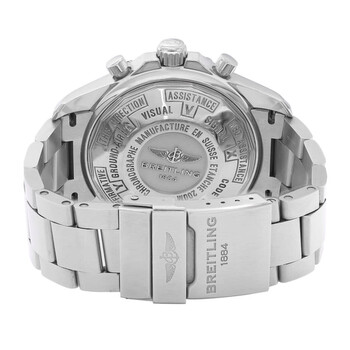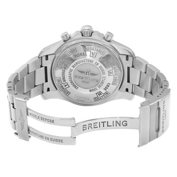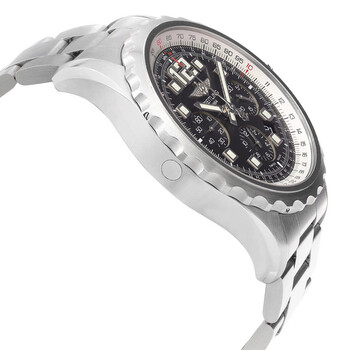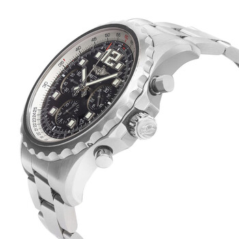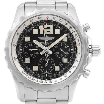Silver-tone stainless steel case and bracelet. Bi-directional rotating silver-tone stainless steel bezel. Black dial with silver-tone hands and Arabic numeral & index hour markers. Minute markers around the outer rim. Dial Type: Analog. Luminescent hands and markers. Between the 4 and 5 o'clock position. Chronograph - two sub-dials displaying: 60 second and 30 minute. Breitling Calibre 23 Automatic movement, based upon ETA 7753, containing 27 Jewels, bitting at 28800 vph, and has a power reserve of approximately 42 hours. Scratch resistant sapphire crystal. Screw down crown. Solid case back. Round case shape, case size: 46 mm, case thickness: 16 mm. Band width: 20 mm, band length: 7 inches. Fold over clasp with a safety release. Water resistant at 200 meters / 660 feet. Functions: chronograph, date, hour, minute, second, chronometer. Chronospace Series. Luxury watch style. Watch label: Swiss Made. Pre-owned Breitling Chronospace Chronograph Automatic Chronometer Black Dial Men's Watch A2336035/BA68-167A.